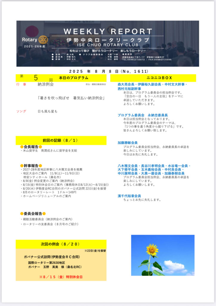 2025-26年度 第5回 (No.1611)伊勢中央ロータリークラブ 週報