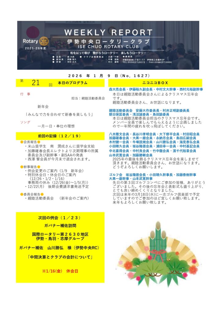 2025-26年度| 第21回 (No.1627)伊勢中央ロータリークラブ 週報