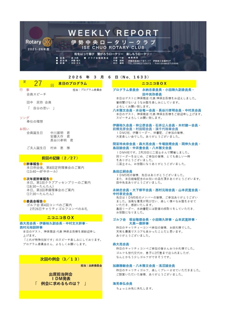 2025-26年度| 第27回 (No.1633)伊勢中央ロータリークラブ 週報