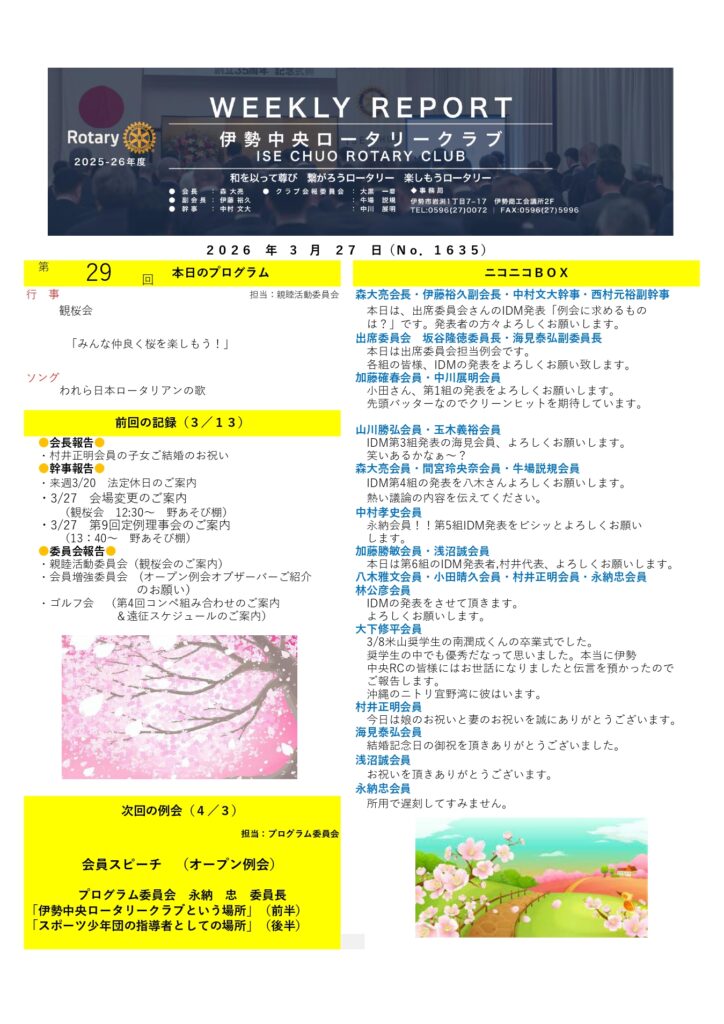 2025-26年度| 第29回 (No.1635)伊勢中央ロータリークラブ 週報